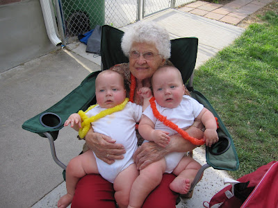 This is Josh's great grandma, so great great grandma to the boys. I asked her if she would hold both of the boys so I could get a picture of them together since I hadn't gotten one yet, and she said sure, as long as they don't cry. It was cute! They didn't hold up their end because they both started screaming! Oooops!
